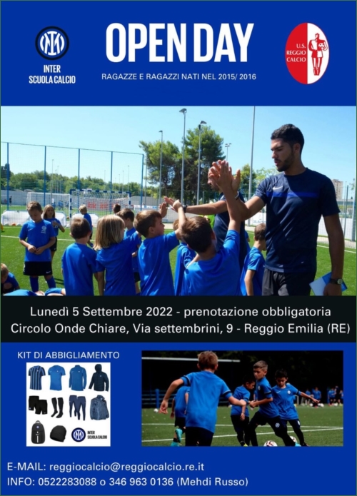 01/09/2022 - OPEN DAY INTER - REGGIO CALCIO LUNEDÌ 5 SETTEMBRE, APERTO A TUTTI I 2015 E 2016, AL CIRCOLO ONDE CHIARE