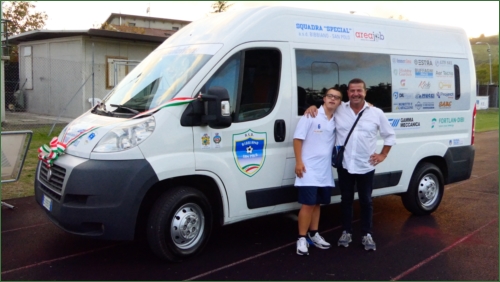 DIDASCALIA: Il presidente Gianni Del Rio assieme a Lorenzo Tognoni della squadra Special che utilizzerà il nuovo pulmino del Bibbiano San Polo