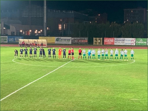 Nella foto, l'Arcetana (a destra) e la Fidentina schierate in campo a inizio gara - immagine realizzata da Mattia Frigoli.