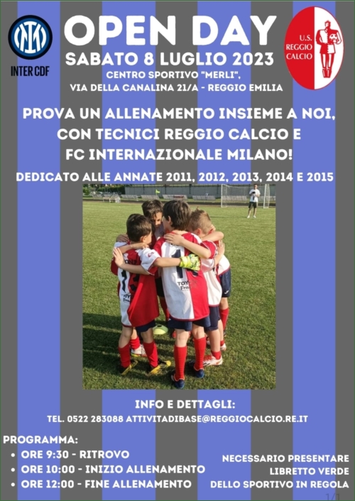 06/07/2023 - Porte aperte alla Reggio Calcio. Sabato 8 luglio, in via della Canalina 21/A, sul sintetico Merli, avrà luogo l’Open Day della Reggio Calcio, organizzato in collaborazione con l’Inter, di cui la società del presidente Giulio Cigarini è Centro di Formazione, nonché Scuola calcio Inter certificata In via della Canalina 21/A, sede della Reggio Calcio, sabato 8 luglio chiunque desideri avvicinarsi al mondo del calcio o chiunque desideri provare le emozioni di giocare alla Reggio Calcio potrà farlo liberamente grazie ad una mattinata di allenamento organizzata dai tecnici della società biancorossa assieme a quelli dell’Inter. All'Open Day potranno partecipare bambini e bambine nati dal 2011 al 2015. I ragazzi dovranno trovarsi alle 9,30 al campo, per poi iniziare gli allenamenti alle 10, con chiusura degli stessi alle 12. Per poter accedere al training sarà necessario presentarsi col libretto verde dello sportivo in regola. La prova è completamente gratuita e aperta a tutti, basta contattare il numero 0522-283088, oppure mandare una mail all’indirizzo: attivitadibase@reggiocalcio.re.it.