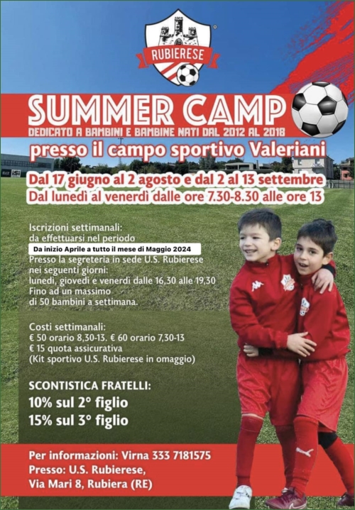 Costi settimanali: 50€ orario 8,30-13. 60€ 7,30-30. (Kit sportivo Us Rubierese in omaggio). In aggiunta una tantum di 15€ di costi assicurativi.