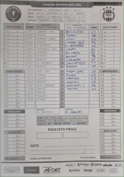 CELTIC CAVRIAGO-POLIVALENTE SAN DAMASO: 2-1