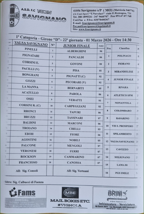 FC VALSA SAVIGNANO-JUNIOR FINALE: 2-0