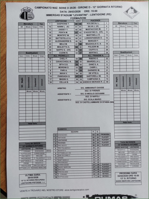 SERIE D: LENTIGIONE-PIACENZA, SPETTACOLO AL LEVANTINI