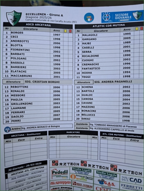 IN VIA CARAFFA ARRIVA L'ATLETIC CDR MUTINA: L'ARCETANA PUNTA A CONSOLIDARE ULTERIORMENTE IL PROPRIO CAMMINO VERSO LA SALVEZZA DIRETTA. IL DIFENSORE BIANCOVERDE RINALDI: "PER NOI PESANTI ASSENZE, MA SAPREMO UGUALMENTE TROVARE VALIDE SOLUZIONI"