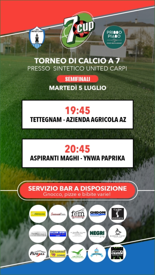 A proposito di caldo. Giunto alle sue fasi più bollenti, il sintetico di SSD United Carpi si prepara ora ad accogliere le 4 squadre più forti del torneo. Un mix di talento e tecnica che infiammerà le semifinali della SevenCup, con partenza nella serata di martedì 5 luglio. Venerdì 8 invece la finale, con in palio un ricco montepremi e riconoscimenti individuali ai migliori giocatori.