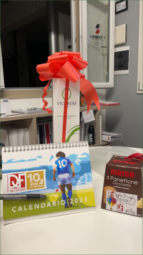 Gli amici di QF Serramenti di Francesco Quitadamo, nostro partner e sostenitore della Fossil Cup, hanno fatto pervenire al nostro sito gli auguri di Natale e di felice anno nuovo. Dei pensieri ricchi di significato: un panettone solidale a sostegno di un'iniziativa che si occupa di persone affette da autismo, un calendario celebrativo dei 10 anni di attività dell'azienda e un olio extra vergine made in Foggia, terra di origine dello stesso Francesco.