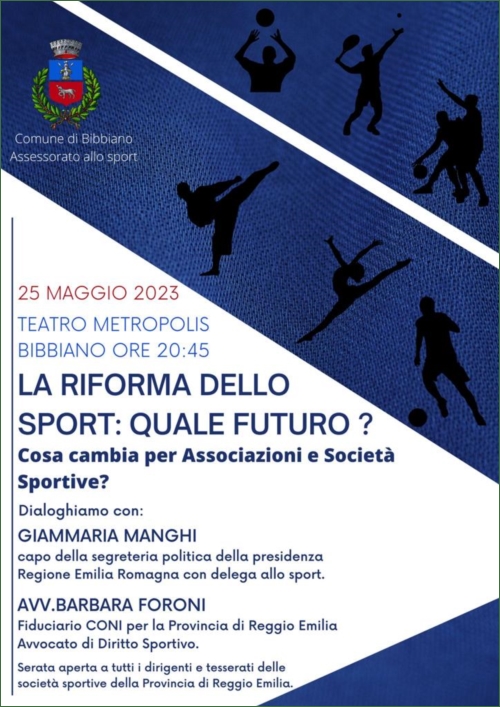 ll Comune di Bibbiano organizza un serata informativa sul tema della Riforma dello Sport, aperta a tutte le associazioni sportive della provincia di Reggio Emilia.