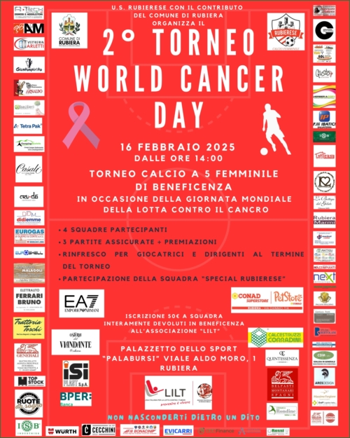 La Rubierese anche quest’anno in occasione della giornata mondiale della lotta contro il cancro, organizza in collaborazione con il Comune di Rubiera, domenica 16 febbraio al Palabursi, il 2ºTorneo World Cancer Day, di calcio a 5 femminile, il cui ricavato sarà interamente devoluto in beneficenza all’associazione “Lilt” di Reggio Emilia.