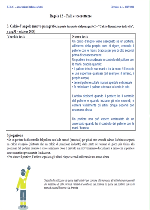 In pratica, se il portiere controlla il pallone con le mani per più di 8 secondi, viene assegnato un calcio d'angolo alla squadra avversaria.