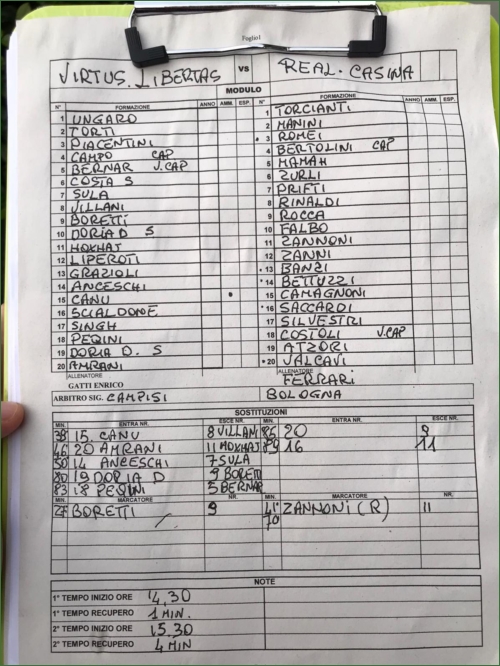 Sotto una pioggia constante usciamo vincitori in un duro confronto contro una buonissima squadra come la Libertas. Oggi a differenza del pareggio di domenica scorsa, l’atteggiamento e la mentalità era quella giusta, e portiamo a casa tre punti pesantissimi. Partiamo molto bene il primo tempo e per circa 25 minuti abbiamo quasi sempre il pallino del gioco, ma i locali ci fanno male alla prima ripartenza con una bella azione di prima che si concretizza nel 1-0. Abbiamo qualche minuto di annebbiamento, ma tiriamo su la testa e ricominciamo a provare a giocare (il terreno di gioco era sempre più pesante) e troviamo il pareggio con Zannoni su calcio di rigore guadagnato da Rocca dopo una bella azione con Falbo. Nel secondo tempo il campo sempre più pesante si fa sentire e il gioco ne risente, ma su in contropiede perfetto segnamo il goal del vantaggio con la zampata di bomber Rocca innescato da Prifti e dopo una fantastica apertura a cambiare campo di Zannoni. Da lì in poi ci difendiamo bene, senza che i padroni di casa riescano a impensierire seriamente il nostro portiere e portiamo a casa il risultato! Una bella prestazione di squadra che ci catapulta nelle zone alte della classifica. Domenica si torna in casa contro la Sammartinese, Forza Real!