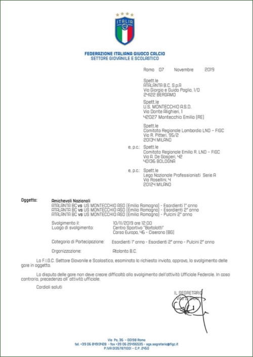 08/11/2019 - Domenica 10 Novembre le squadre delle nostre annate 2006, 2008 e 2009 giocheranno in amichevole con le corrispondenti squadre di ATALANTA B.C. presso il Centro Sportivo “Bortolotti” di Zingonia a Bergamo. Le partite sono state organizzate da Stefano Bonaccorso, Responsabile delle Attività di Base del Settore Giovanile Atalantino, che U.S. Montecchio Calcio ringrazia sinceramente per la splendida opportunità, e sono state autorizzate ufficialmente da Federazione Italiana Giuoco Calcio, come da comunicato FIGC di Roma allegato. Due pullman di giocatori e genitori partiranno con tanto entusiasmo da Montecchio domenica mattina alla volta di Bergamo per vivere tutti insieme l’intera giornata, che comprende anche il pranzo di gruppo a fine match. Buon divertimento, ragazzi!