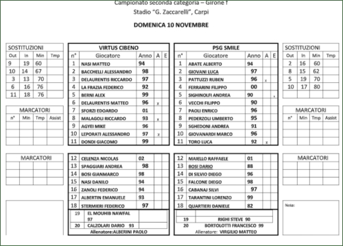 10/11/2019 - Finisce in pareggio la sfida tra Virtus Cibeno e PSG smile. I locali partono subito forte e al 2’ minuto si rendono pericolosi con Leporati, ma il suo tiro viene respinto dai difensori. Al 20’ la Virtus si rende pericolosa con Bacchelli ma il suo tiro viene respinto in angolo dal portiere ospite. Al 35’ gli ospiti si rendono pericolosi con Toro,ma il suo colpo di testa termina alto sopra la traversa. Il primo tempo si chiude senza altre occasioni. Il secondo tempo si apre con una grande occasione per Toro, ma il suo tiro finisce di poco a lato. Al 54’ i locali si rendono pericolosi con Agyei che calcia a lato sfiorando il palo. Al 67’ gli ospiti si rendono pericolosi con Giovanardi, ma il suo tiro termina sulla traversa. Al 80’ altra occosione per Giovanardi , ma Nasi para a terra. Al 86ì Nasi si ripete su Toro deviando in angolo un tiro pericoloso. In pieno recupero Nasi compie due interventi super. Il primo su Paoli e il secondo su Vecchi sempre su azione da calcio d’angolo. Pareggio risultato giusto considerando entrambi i tempi.