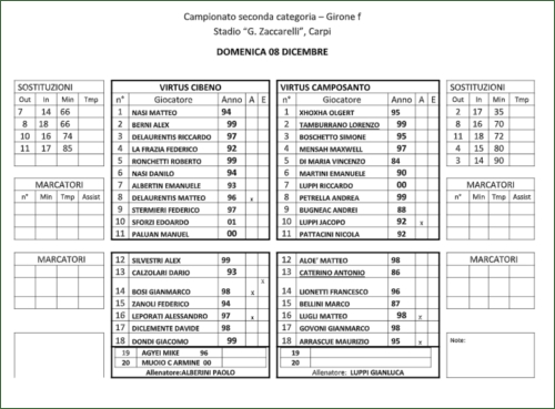08/12/2019 - Finisce in pareggio la gara tra Virtus Cibeno e Virtus Camposanto. Al 12’ si vedono gli ospiti con Pattaccini ma il suo tiro finisce a lato. Al 16’ ci prova dal limite Bugneac con un tiro a giro ben parato da Nasi. Al 21’ la prima occasione per il Cibeno con Paluan che al momento del tiro viene anticipato dalla difesa ospite su azione di ripartenza. Al 29’ bella azione di Luppi ma il suo cross finisce a lato. Al 30’ ci prova Boschetto con un tiro da fuori area che termina a lato. Al 44’ la miglior occasione di tutta la partita con Paluan che sfruttando un errore difensivo si presenta davanti al portiere , ma il suo tiro finisce a lato. Il secondo tempo si apre con un occasione di testa per Di maria che termina alto sopra la traversa. Al 56’ ci prova Luppi con un gran giocata nello stretto ma il suo tiro a botta sicura viene parato da un ottimo Nasi che compie un vero miracolo. Al 68’ e’ Ronchetti a sventare un tiro pericoloso di Govoni. La partita volge al termine senza altre emozioni . Buon punto per i locali su un campo pesante su cui era difficile giocare.