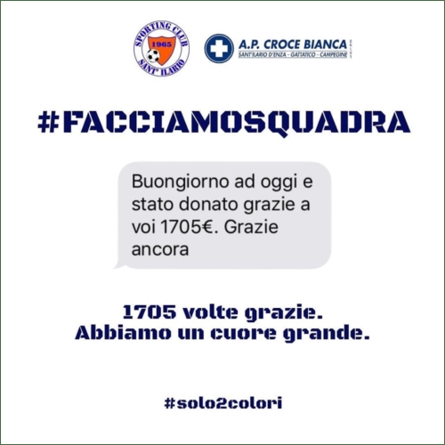 28/05/2020 - Un risultato eccezionale per la raccolta fondi #FacciamoSquadra. Il denaro raccolto sarà impiegato per acquistare dispositivi di protezione individuale che permetteranno alla Croce Bianca di lavorare ancora più in sicurezza. Grazie di cuore a tutti e viva la gente dello Sporting!