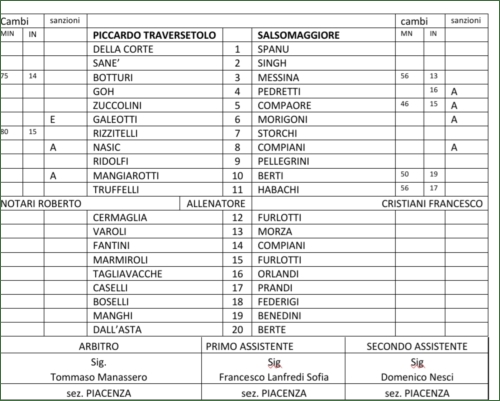21/11/2021 - Partita importante per entrambe le squadre che si giocano la possibilità di rimanere in scia delle prime. Primi 20 minuti con le due squadre che si affrontano a viso aperto senza però produrre grandi occasioni. Partita equilibrata e molto tattica che potrebbe trovare una chiave di svolta al 28 quando l’arbitro decide di espellere Galeotti per fallo da ultimo uomo su Pellegrini, l’impressione di tutti i presenti è in totale disaccordo con la decisione arbitrale, poiché è palese il fatto che a commettere fallo sia il centravanti termale. L’inferiorità numerica per assurdo galvanizza la Piccardo che va vicino al gol con Truffelli al 29 e Rizzitelli al 36, anche se l’occasione più grossa capita agli ospiti sui piedi di Pellegrini al 38 che da posizione invidiabile batte a colpo sicuro ma spedisce sul fondo. La ripresa comincia con la squadra di casa che continua a spingere nonostante l’inferiorità numerica e che trova il meritato vantaggio al 58 con Ridolfi autori di un inserimento personale che porta a tu per tu con Spanu: bomba ad incrociare del centravanti giallo nero e vantaggio per la Piccardo. Piccardo che va vicino al raddoppio con Mangiarotti ben servito al limite da Truffelli, sulla conclusione del 10 giallonero è bravo Spanu a deviare in corner. Incredibilmente è sempre la Piccardo a fare la partita e a sfiorare il raddoppio nuovamente con Mangiarotti che stavolta ci prova su punizione diretti ma è ancora Spanu ad erigersi a protagonista con una bella parata. Salso che non riesce ad organizzare un vero e proprio forcing finale, l’occasione più ghiotta capita allo scadere dei sei minuti di recupero concessi dall’arbitro quando sugli sviluppi di un calcio punizione si crea una mischia e gli ospiti troverebbero il pareggio ma per la terna si tratta di fuorigioco.