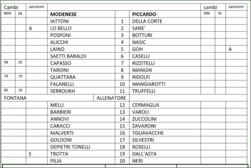 28/11/2021 - CRONACA Partita molto bloccata condizionata dal campo per avere un’occasione bisogna aspettare il 26 quando la Piccardo imbastisce un’ azione corale sulla destra con la palla che viene servita a Mangiarotti che s’inventa un fantastico filtrante per Rizzitelli che si ritrova a tu per tu con il portiere che è bravo con la mano di richiamo a salvare il risultato. Rispondono i padroni di casa tra il 30esimo e il 34esimo con Capasso e con Quattara con due conclusioni ravvicinate nelle quali è provvidenziale Della Corte a respingere Al 43 l’arbitro s’inventa un rigore per i padroni di casa: Nasic rinvia il pallone e un avversario gli frana addosso, ma per l’arbitro è inspiegabilmente rigore. Dal dischetto si presenta Falanelli che si fa respingere la conclusione da Della Corte ma sulla ribattuta è ancora Falanelli a portare in vantaggio i padroni di casa. Ripresa che comincia con i padroni di casa che cercano di sorprendere la Piccardo alla ricerca del raddoppio ma Della Corte è ancora bravo a respingere i tentativi dalla distanza dei padroni di casa. Con il passare del tempo la pressione degli uomini di Notari inizia a farsi ad aumentare e la Piccardo diventa padrone del gioco e raggiunge il pareggio sugli sviluppi di un calcio d’angolo con Goh che anticipa il portiere in uscita. Piccardo che continua a premere e poco dopo va vicino al gol con Ridolfi che in scivolata devia di poco sul fondo un invitante cross di Rizzitelli. Al 85 è miracoloso l’intervento del portiere Iattoni su un diagonale potente e rasoterra di Ridolfi. Poco dopo occasionissima per il neo entrato Trotta che da buona posizione spedisce alto sulla traversa. Sullo scadere della partita altra occasione per la Piccardo con una pregevole sforbiciata di Mangiarotti che però Iattoni blocca. La partita finisce con un giusto pareggio.