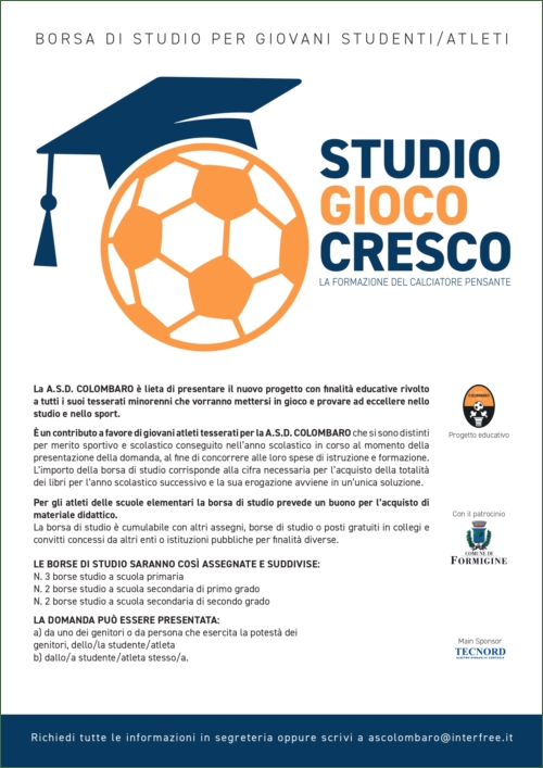 Nell’anno commemorativo del cinquantesimo dalla nascita della società sportiva, la A.S.D. COLOMBARO presenta il nuovo progetto didattico rivolto a tutti i suoi giovani calciatori che si distinguono sia nello studio che nello sport, destinando nove borse di studio a copertura dei tre cicli scolastici principali: scuola primaria, secondaria di primo grado, secondaria di secondo grado.