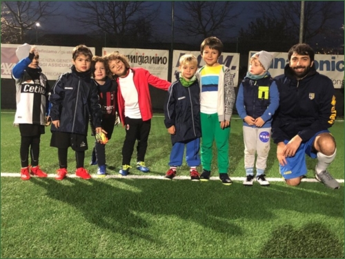 DIDASCALIA: A destra, Andrea Pesci dello studio Officina del Corpo, nonché istruttore della Bassa Parmense, con alcuni bambini sul sintetico di Trecasali