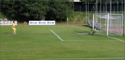 Il rigore trasformato da Leonardo Iaquinta, numero dieci del Montecchio, ex mediano della Vianese. Della Corte tocca solo il pallone, ma non riesce a deviarlo