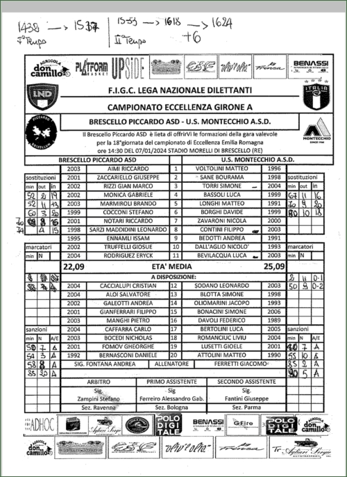 Partita che inaugura il 2024 e che per la squadra locale inizia male e finisce peggio. Al primo minuto Aimi ritarda il rinvio e il rimpallo con Bedotti favorisce quest'ultimo che riesce a mettere la palla in mezzo e per primo arriva Bevilacqua che porta in vantaggio i suoi. La reazione della squadra di casa è in due cross che partono dalla sinistra il primo di Notari che trova Rizzi che alza troppo la mira e la palla finisce alta. Altro cross stavolta dalla sinistra con Truffelli che arriva di testa ma la palla è fuori. Da lì in avanti si combatte a centrocampo su un terreno reso pesante dalla pioggia e si va al riposo sul risultato di 0-1. Si torna in campo ed invece del Brescello Piccardo a colpire è ancora il Montecchio con Bedotti che si infila tra le maglie dei difensori locali e batte Aimi sul secondo palo. Inizia la girandola dei cambi che però non porta i frutti sperati e l'unica occasione capita sui piedi di Notari che tira dal limite dell'area con Voltolini che compie una gran parata. Per il resto dell'incontro c'è una gran lotta a centrocampo ma complice anche la stanchezza sono molti gli errori da ambo le parti. Finisce dopo cinque minuti di recupero la partita con il Montecchio che ha meritato di vincere la partita. Ottima la direzione di gara del Sig. Zampini della sezione di Ravenna.