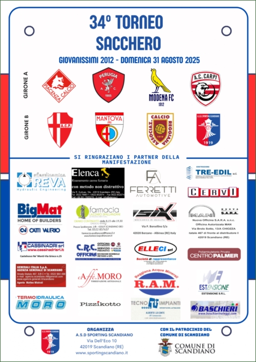 28/08/2025 - SPORTING SCANDIANO: DOMENICA 31 AGOSTO 34° TORNEO SACCHERO DEDICATO ALLA CATEGORIA GIOVANISSIMI