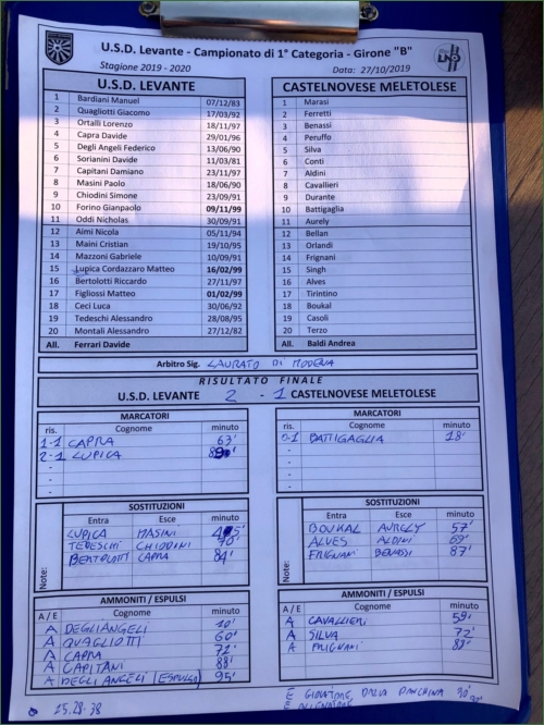 27/10/2019 - Al Cantoni si affrontano Usd Levante e Castelnovese entrambe assetate di punti per smuovere una classifica stagnante. Nel primo tempo padroni di casa non pervenuti sul campo gli ospiti dominano in tutti i reparti è solo grazie all'ottimo lavoro di bardiani e del duo difensivo degli Angeli Sorianini si va negli spogliatoi sullo 0 a 1 grazie al gol di Battigaglia al 18'. Nel secondo tempo i padroni di casa entrano in campo con più convinzione e cercano perlomeno di creare qualcosa affacciandosi Timidamente nella metà campo avversaria. Il forcing perlopiùsterile si traduce in un gol grazie un cross da sinistra e link giornata di capra che anticipa un incerto Marasi. La Castelnovese aumenta il pressing ma trova sempre una difesa attenta e non riesce ad impensierire bardiani. L'innesto di tedeschi da una scossa ad un Levante che sembrerebbe appagato dal pareggio. Così sugli sviluppi di una mischia in area nasce il secondo gol del definitivo 2-1 siglato da Lupica