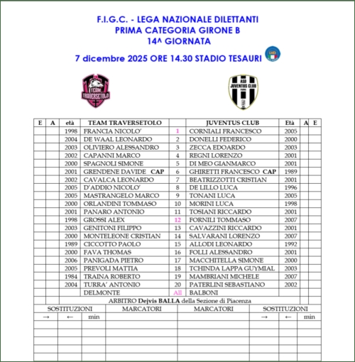 TEAM TRAVERSETOLO-JUVENTUS CLUB PARMA: 1-0
