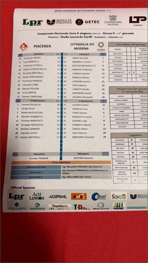 PIACENZA-CITTADELLA VIS MODENA: 1-1