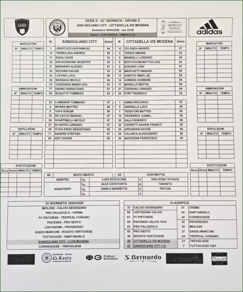 SANGIULIANO CITY-CITTADELLA VIS MODENA: 0-1