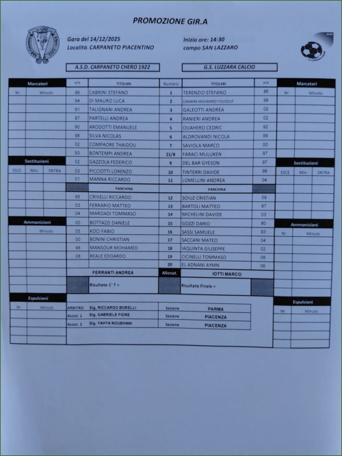 CARPANETO CHERO 1922-LUZZARA: 0-2