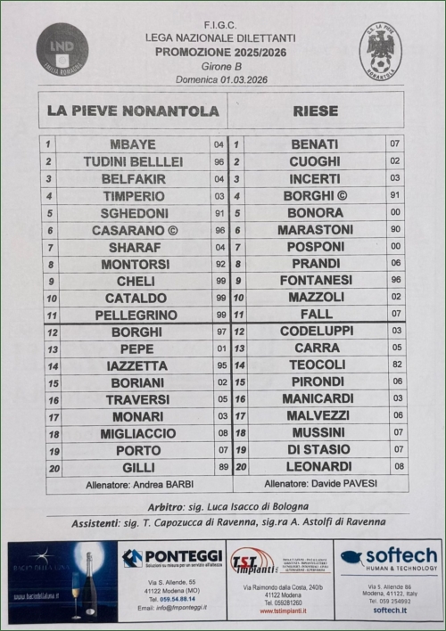 LA PIEVE NONANTOLA-RIESE: 1-2