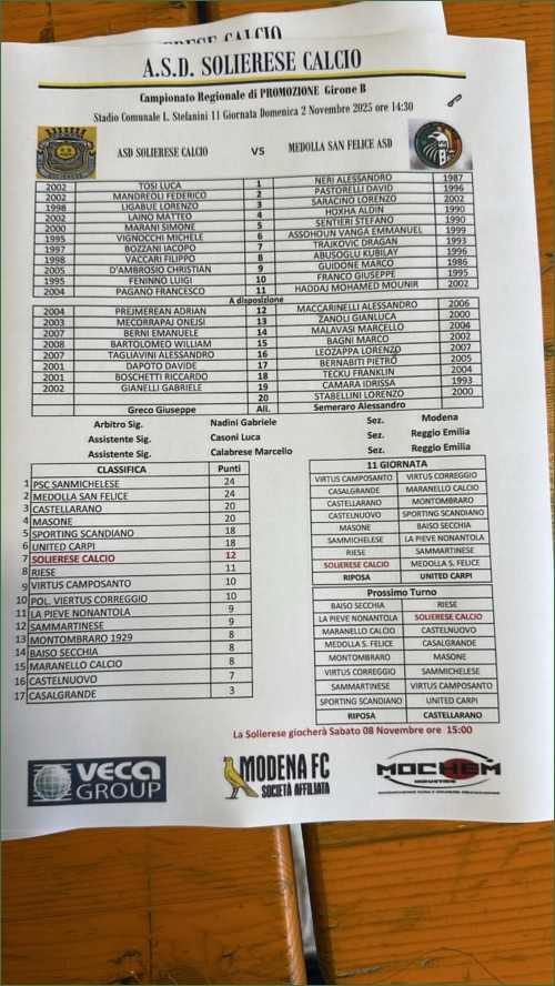 SOLIERESE CALCIO-MEDOLLA SAN FELICE: 0-1