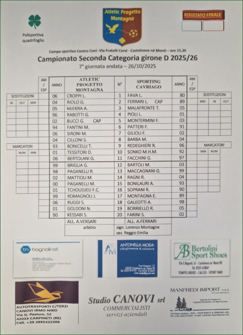 ATLETIC PROGETTO MONTAGNA-SPORTING CAVRIAGO: 3-2