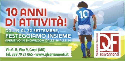 QF Serramenti compie 10 anni di attività e per celebrare al meglio questo traguardo dal 19 al 22 settembre sarà organizzato un aperitivo presso lo showroom di Carpi in via G.B. Vico 9.