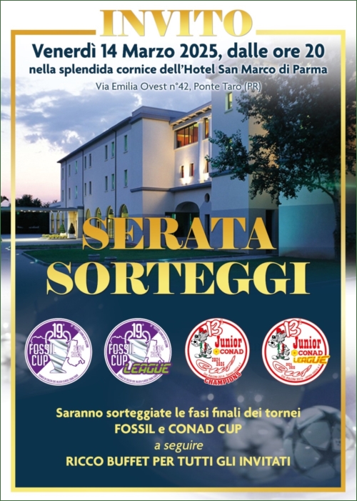 Venerdì 14 marzo alle ore 20 all'Hotel San Marco di Parma si terrà la grande serata evento dei sorteggi dove saranno protagoniste le 16 società qualificate agli ottavi di Fossil Cup e le 8 società qualificate ai quarti di Fossil League.