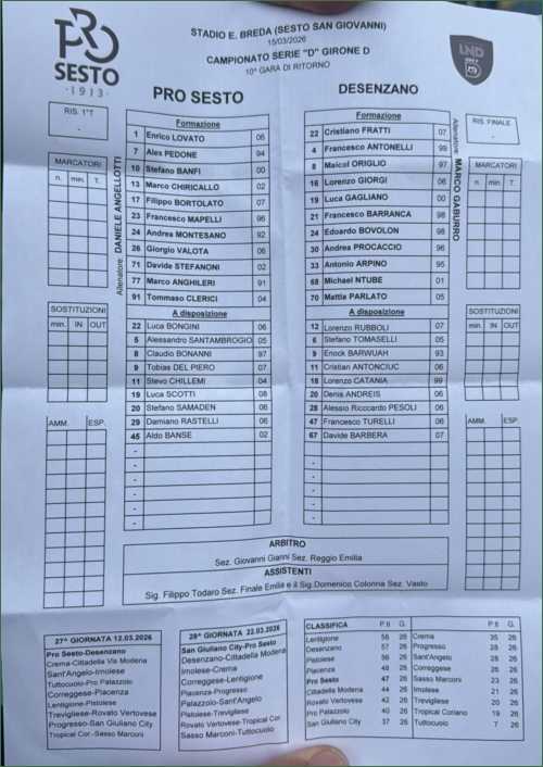 SERIE D: PRO SESTO-DESENZANO DUELLO AL BREDA