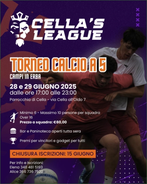 Dopo il clamoroso successo dello scorso anno, sullo splendido manto erboso del Parrocchiale di Cella, anche quest'anno torneranno le emozioni della Cella's League. Formate la vostra squadra e preparatevi per una due giorni di fuoco! (28-29 Giugno)